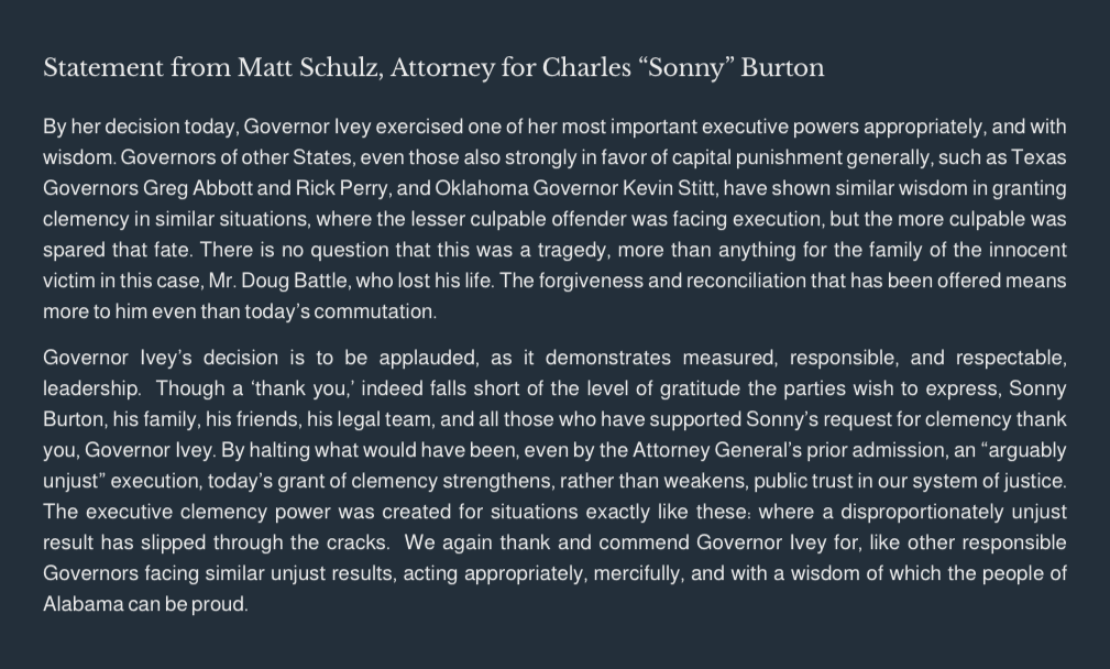 “We are grateful to Governor Ivey for carefully considering this case and granting clemency to Mr. Burton,” said Cecilia Vaca, Executive Director of the Federal Defenders of Middle Alabama. “Sonny’s team is with him now sharing the news, and they will have more to say very soon. For now, we are profoundly grateful that Sonny’s life has been spared.”